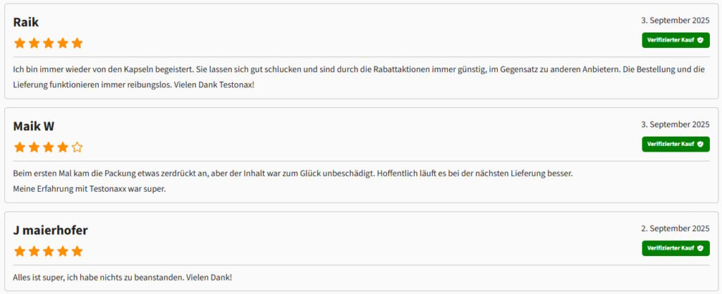 Gefällt dir die Bestellung nicht, sendest du sie innerhalb von 14 Tagen ungeöffnet zurück; die Erstattung erfolgt nach Eingang und Prüfung, meist innerhalb von 14 Tagen. Die Kreditkarte wird erst belastet, wenn die Ware unser Lager verlässt. So kaufst du Testonax stressfrei, transparent und mit klarem Überblick. Bei Testonax behältst du jederzeit den Überblick. Das gibt dir Sicherheit – und mehr Raum für deine Vitalität im Alltag.