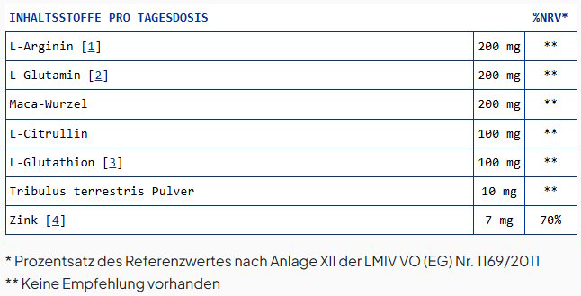 Pro Tagesportion: L-Arginin (200 mg), L-Glutamin (200 mg), Maca (200 mg), L-Citrullin (100 mg), L-Glutathion (100 mg), Tribulus (10 mg) und Zink (7 mg, 70 % NRV). Für Zink ist u. a. der Claim zum normalen Testosteronspiegel zugelassen.